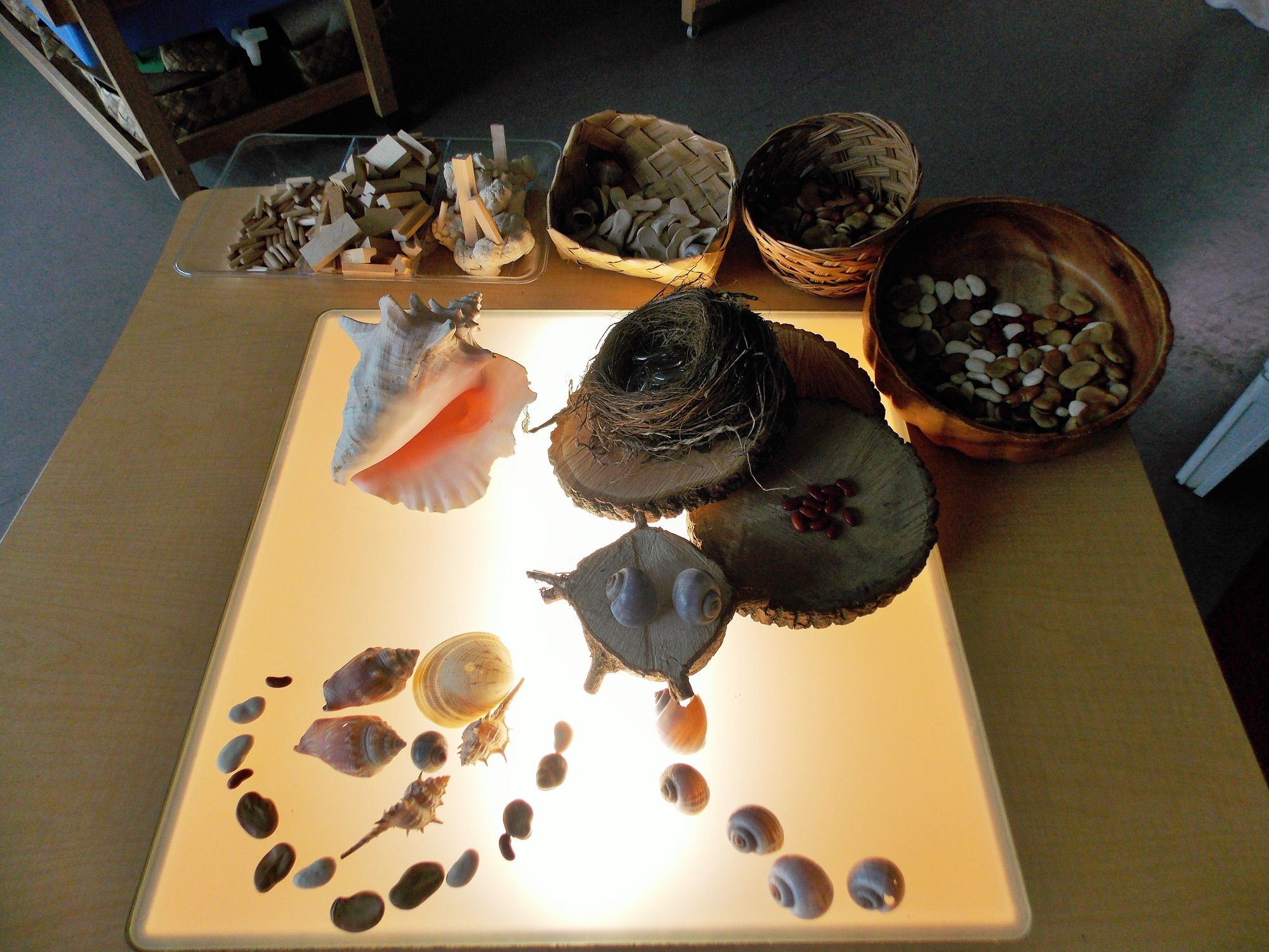 This Natural Pod light table is always busy and home to curiosity, discovery and imagination. Mrs. St. Onge brings together the children's interest in building and adds in natural materials.